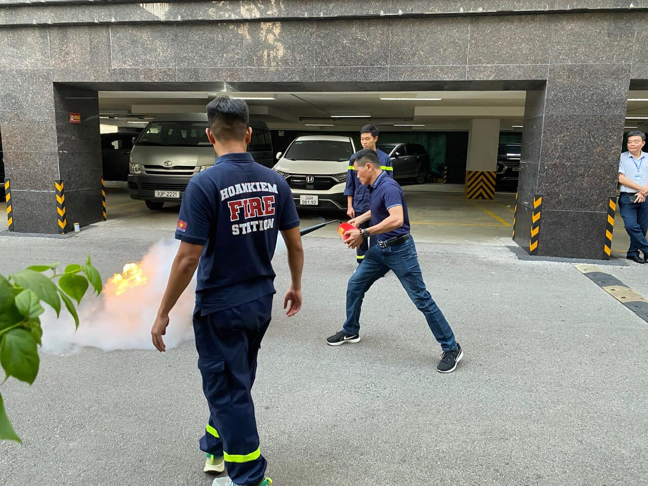 Đội PCCC cơ sở được hướng dẫn việc di chuyển tài sản ra khỏi khu vực bị cháy; Sử dụng bình chữa cháy xách tay, họng nước chữa cháy vách tường tiếp cận khu vực cháy (đốt giả định điểm cháy theo tình huống) và phun dập tắt đám cháy.