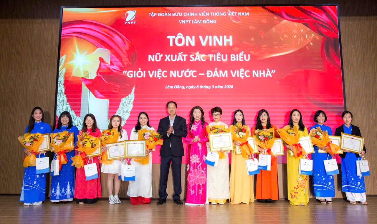 Dịp này, VNPT Lâm Đồng đã vinh danh 41 gương mặt nữ tiêu biểu có thành tích xuất sắc tiêu biểu trong phong trào “Giỏi viêc nước - Đảm viêc nhà”. Những phần quà ý nghĩa cùng màn quay số may mắn (Lucky Draw) sôi động đã khép lại một ngày lễ trọn vẹn niềm vui và sự gắn kết. Sự kiện không chỉ khẳng định vị thế của người phụ nữ trong kỷ nguyên số mà còn là nguồn động lực to lớn để phái đẹp VNPT Lâm Đồng tiếp tục "vững bước" và "vươn xa".