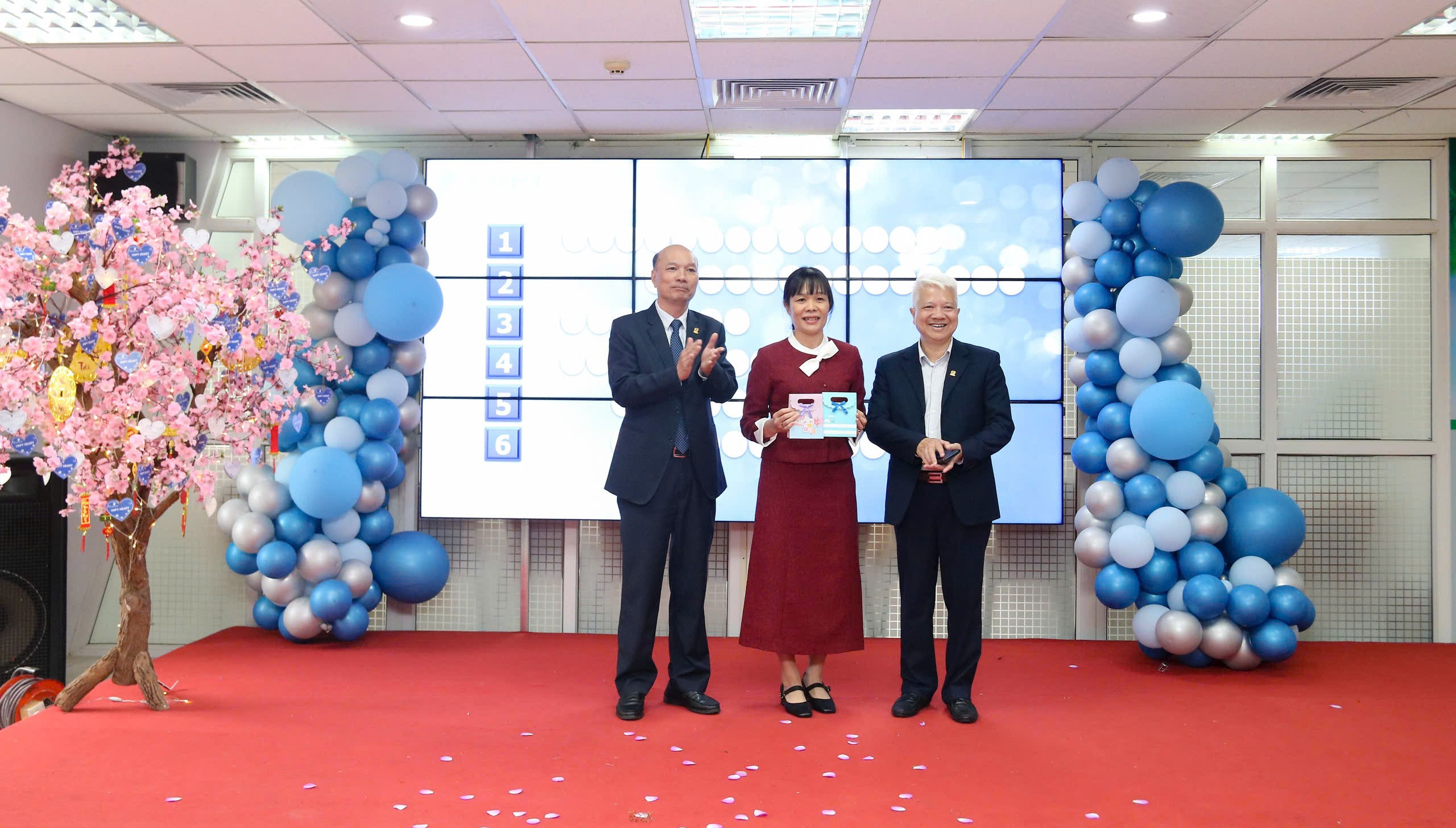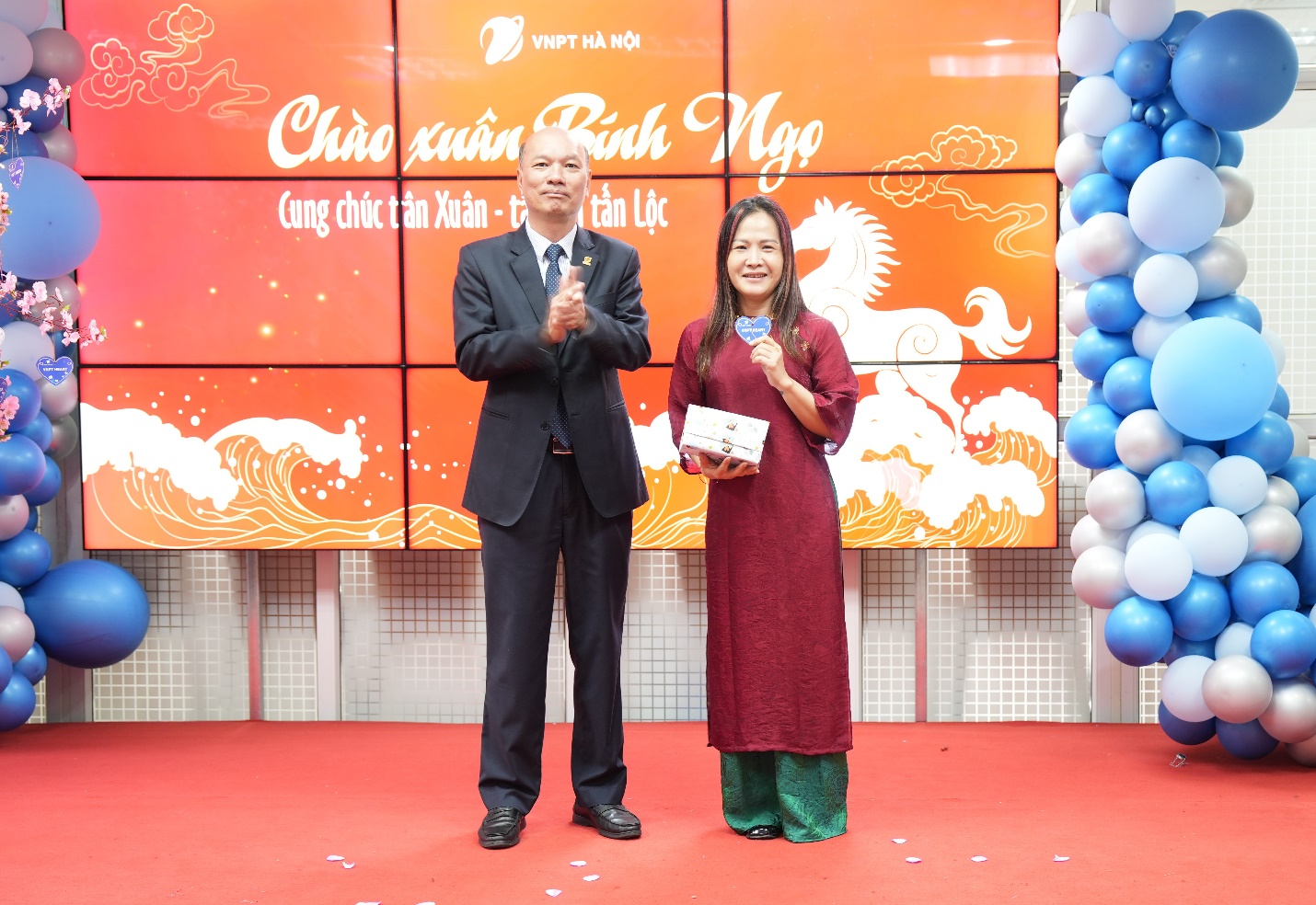 Ông Lương Cao Chí – BT Đảng ủy, Giám đốc VNPT Hà Nội và ông Nguyễn Hữu Chỉnh – Chủ tịch Công đoàn VNPT Hà Nội trao thưởng cho chị Nông Thu Trang – người đoán đúng Từ hàng ngang và Từ khóa trong chương trình Ô chữ mùa xuân – tìm hiểu các nội dung Văn hóa VNPT Heart 2026.