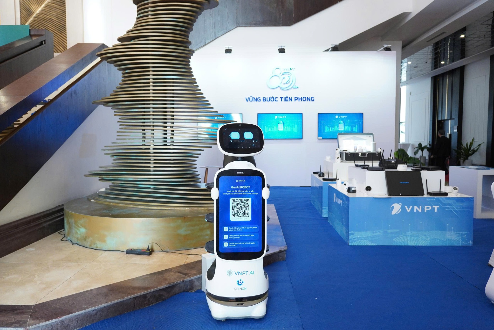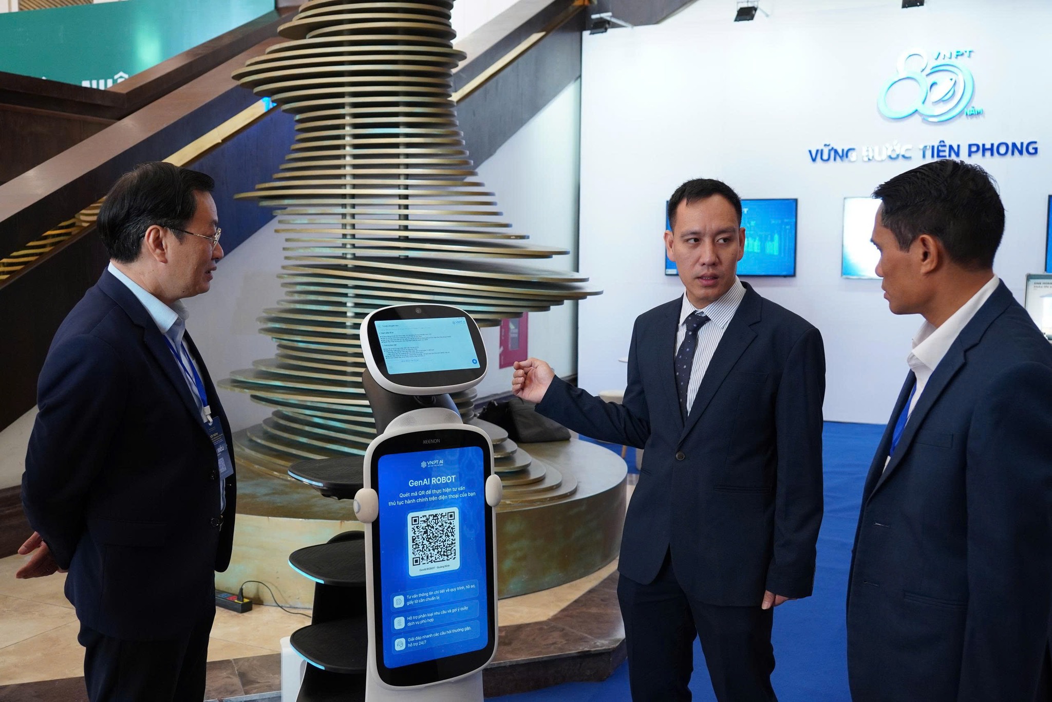 Đặc biệt, thu hút sự quan tâm của đông đảo khách tham dự là Robot AI Hành chính công – giải pháp ứng dụng trí tuệ nhân tạo hiện đại do VNPT phát triển. Robot có khả năng đàm thoại tiếng Việt tự nhiên, hỗ trợ hướng dẫn thủ tục hành chính bằng giọng nói, tự động hóa quy trình tiếp đón – chỉ dẫn và thậm chí có thể nhảy theo nhạc, dẫn đường đến các gian hàng trong Hội nghị, tạo nên điểm nhấn công nghệ khác biệt.